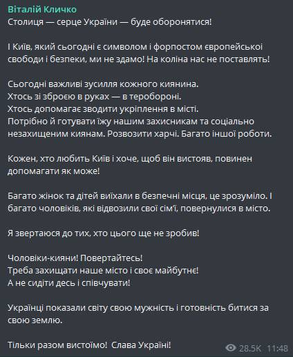 "Мужчины-киевляне! Возвращайтесь! Надо защищать наш город и свое будущее! А не сидеть где-нибудь и сочувствовать!" - призвал Кличко и добавил, что украинцы показали миру свое мужество и готовность сражаться за свою землю.