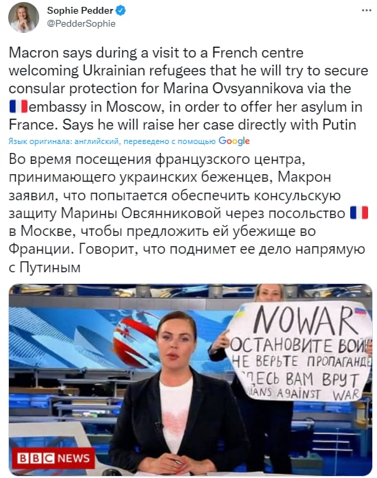 Президент Франции Эмманюэль Макрон заявил, что предложит политическое убежище россиянке Марине Овсянниковой, которая устроила антивоенную акцию в прямом эфире Первого канала. Он заявил, что поднимет этот разговор лично с Путиным. Об этом в Twitter написала журналистка София Педдер.