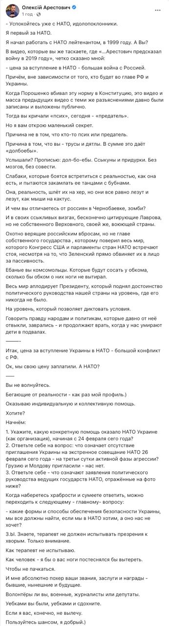 Советник главы Офиса президента Алексей Арестович гневно ответил политикам, критикующим президента Украины Владимира Зеленского из-за отказа от НАТО. Пост появился в Facebook.