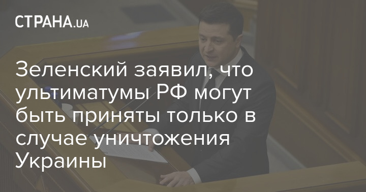 Президент Украины Владимир Зеленский заявил, что ультиматумы Российской Федерации неприемлемы для Украины. По его словам, они могут быть приняты лишь в случае уничтожения Украины.
