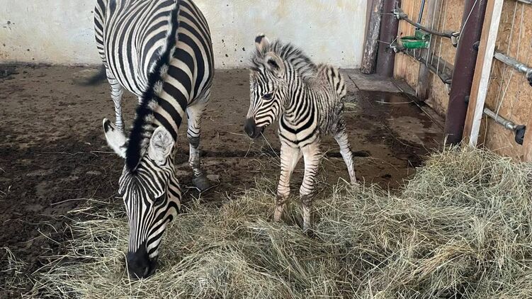 Малыш хорошо ест и не отходит ни на шаг от мамы. По словам Сергея Бурча, начальника отдела копытных, пополнения у семейства зебр ждали очень давно, но судьба распорядилась так, что жеребенок родился в военное время, когда условия для выживания слишком непросты.
