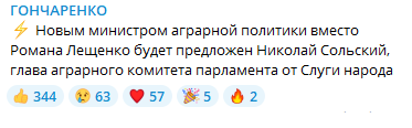 Новым министром аграрной политики вместо Романа Лещенко будет предложен Николай Сольский - глава аграрного комитета парламента от "Слуги народа".