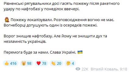 В Ровенской области спасатели до сих пор тушат пожар на нефтебазе, который вспыхнул после ракетного удара вечером в понедельник, 28 марта.