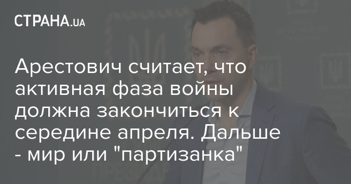 Советник главы Офиса президента Украины Алексей Арестович заявил, что активная фаза войны должна закончиться к середине апреля. Если до этого срока не будет мирного соглашения, то, по его мнению, начнется партизанская война.