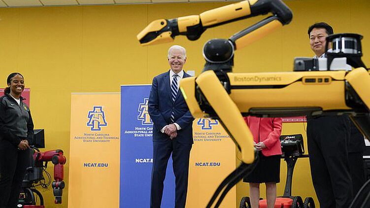 Президент США Джо Байден посетил комплекс инженерных исследований и инноваций в Сельскохозяйственном и техническом государственном университете Северной Каролины в Гринсборо. Там ему продемонстрировали робота-собаку Спот (Spot) от Boston Dynamics. Глава Белого дома тут же попробовал натравить устройство на журналистов.