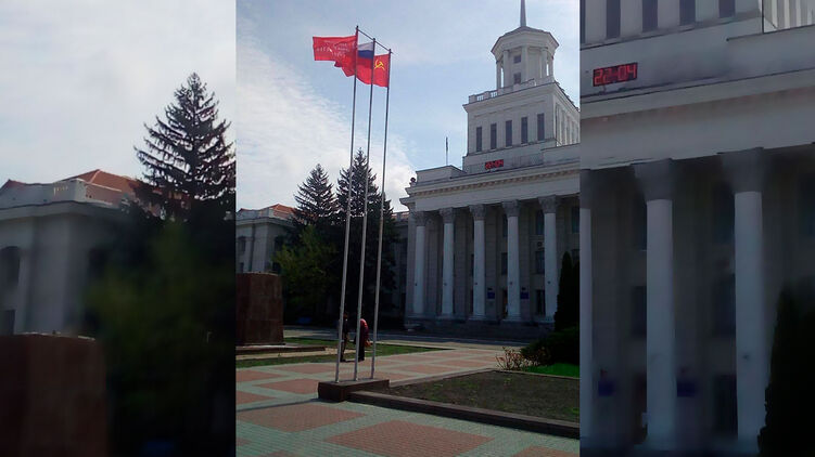 Россияне подняли у захваченной администрации флаг России, флаг СССР и "знамя победы". Украинского флага возле мэрии уже нет.