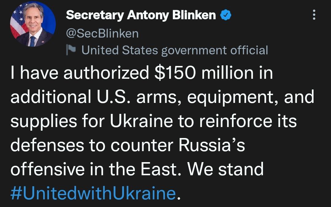 "Я санкционировал дополнительные 150 миллионов долларов на американское вооружение, оборудование и материалы для Украины, чтобы усилить ее оборону, чтобы противостоять наступлению России на востоке. Мы остаемся #объединенные с Украиной", - написал Блинкен.