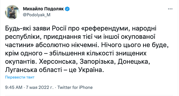 "Любые заявления России о "референдумах, народных республиках, присоединении той или иной оккупированной части" абсолютно ничтожны. Ничего этого не будет, кроме одного - увеличения количества уничтоженных оккупантов. Херсонская, Запорожская, Донецкая, Луганская области - это Украина", - заявил Подоляк.