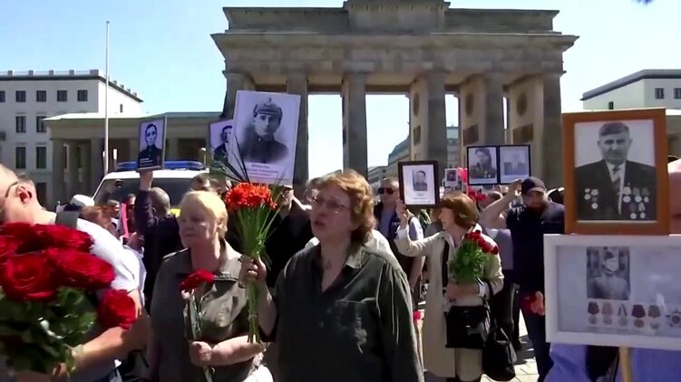 В интернете появилось видео, как сегодня отмечали День Победы в Трептов-парке Берлина, где стоит мемориал советскому воину-освободителю.