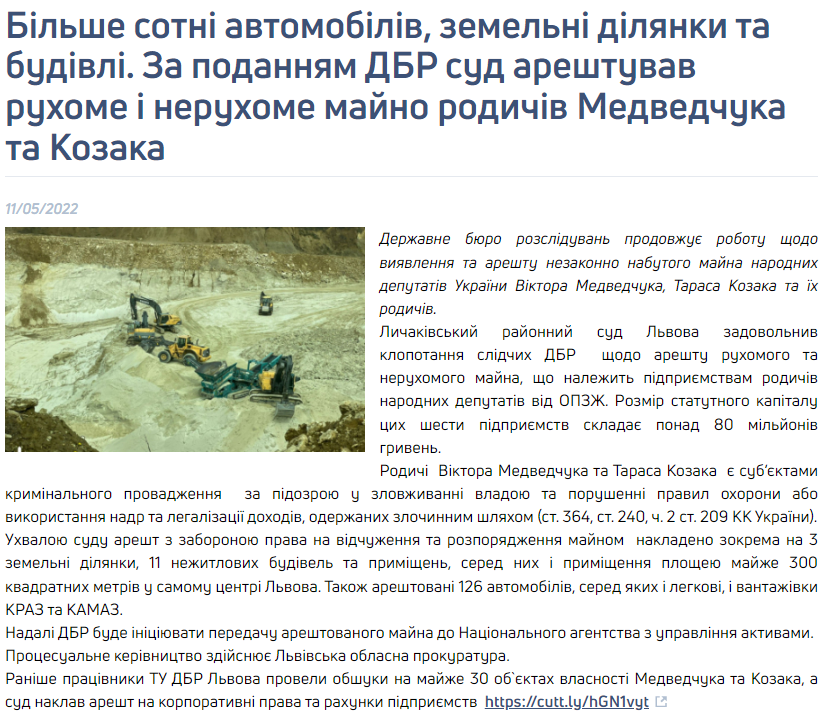 Лычаковский районный суд Львова арестовал недвижимость, которая принадлежала предприятиям родственников народных депутатов Виктора Медведчука и Тараса Козака. Общая сумма капитала составила более 80 млн гривен.