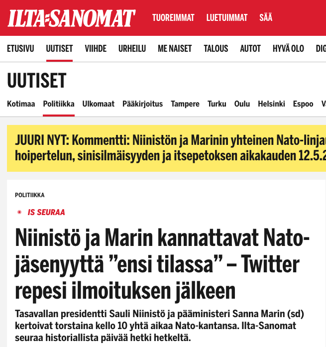 Сообщается, что фактическое предложение подать заявку на членство в НАТО будет сделано в воскресенье после того, как социально-демократическая партия Финляндии изложит свою позицию после заседания совета партии в субботу.