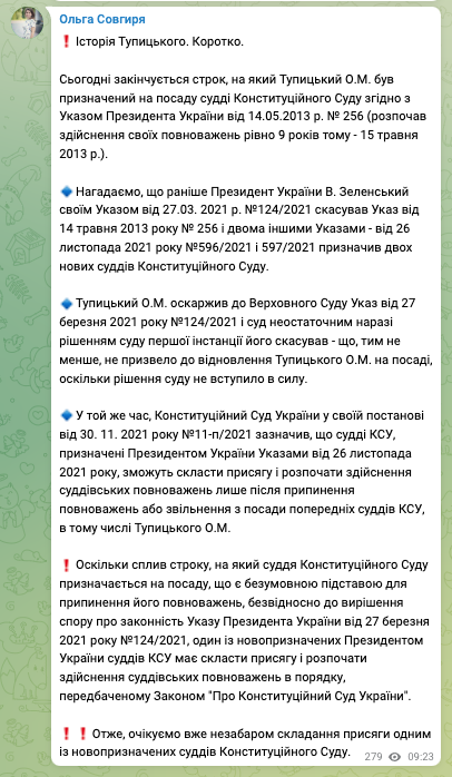 Об этом сообщила в Телеграм представитель Верховной Рады в КСУ Ольга Совгиря.