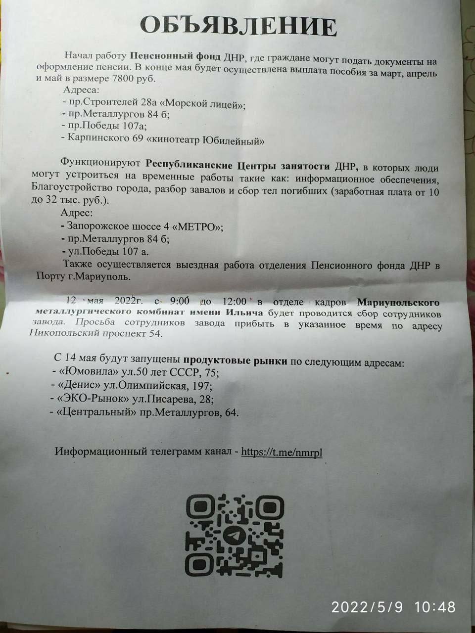 Также планируется, судя по всему, перезапуск меткомбината Ильича - поскольку его сотрудников просят явиться в отел кадров предприятия (о том, что предприятие будет восстановлено, говорят и в "ДНР").