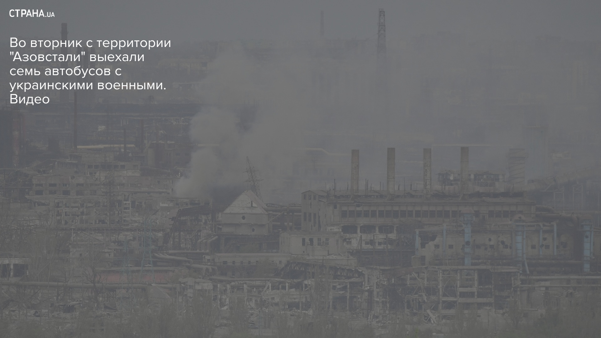 По меньшей мере семь автобусов с украинскими военными выехали во вторник с металлургического завода "Азовсталь" в сопровождении российской бронетехники.