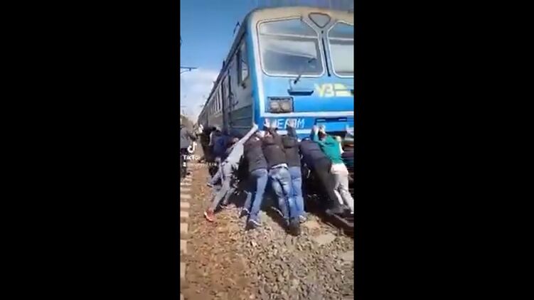 Под Киевом пассажиры не растерялись и отбуксировали электричку вручную.