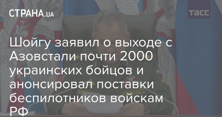 Министр обороны РФ Сергей Шойгу заявил, что к настоящему моменту с завода "Азовсталь" в Мариуполе уже вышло почти 2 000 украинских военных. Об этом Шойгу заявил 20 мая, сообщают российские СМИ.