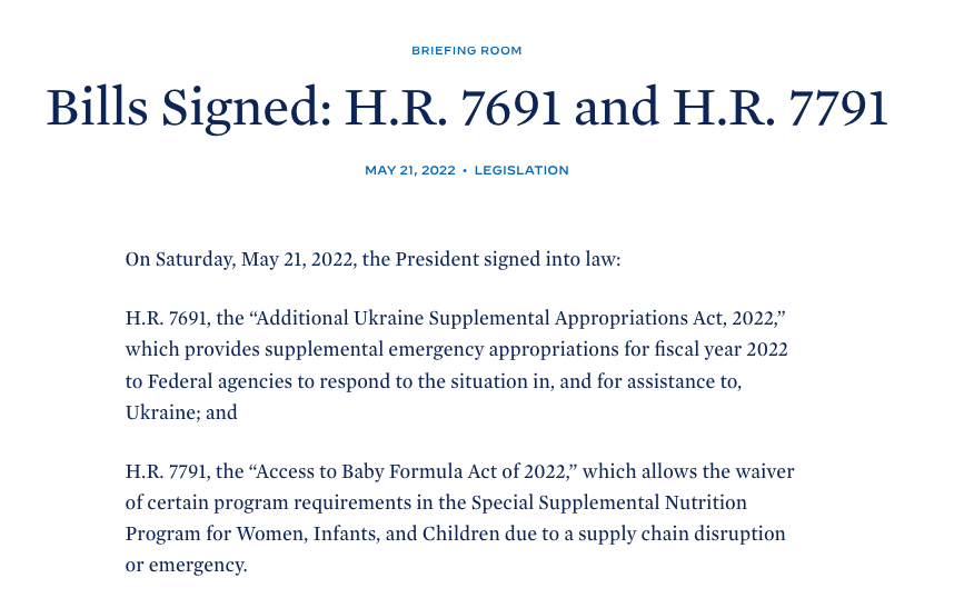 "Президент подписал закон HR 7691, "Закон о дополнительных ассигнованиях в Украину на 2022 год", который предусматривает дополнительные чрезвычайные ассигнования на 2022 финансовый год федеральным агентствам для реагирования на ситуацию в Украине и для оказания помощи", - говорится в сообщении.