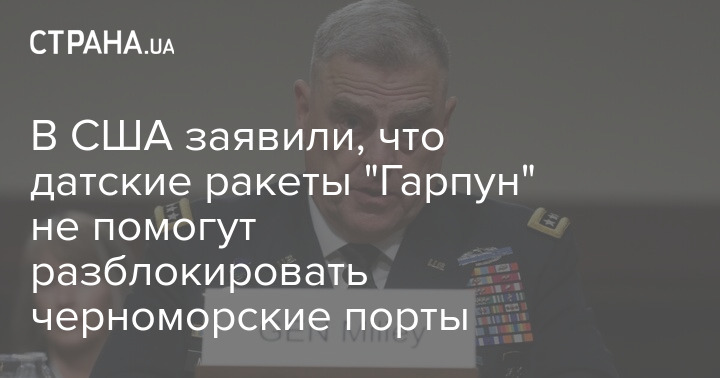 Председатель Объединенного комитета начальников штабов США Марк Милли прокомментировал поставки ракет "Гарпун" Украине. По его словам, они не помогут разблокировать порты.
