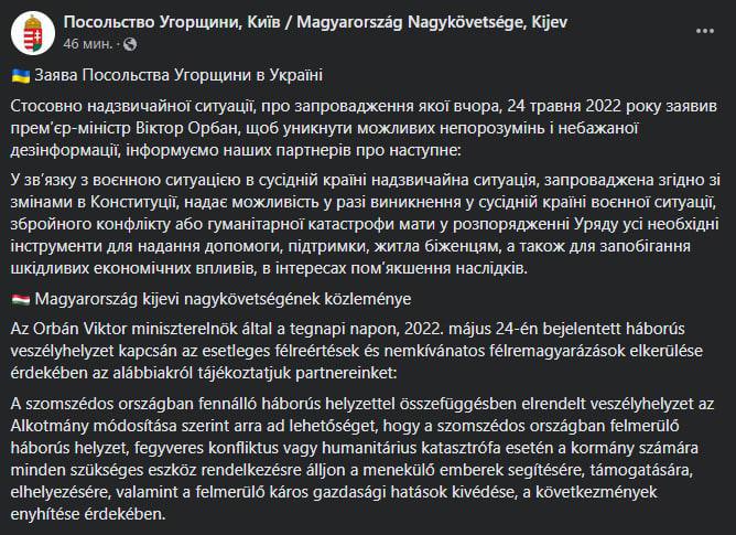 Посольство Венгрии в Украине опубликовало разъяснение по введению режима чрезвычайной ситуации в государстве.