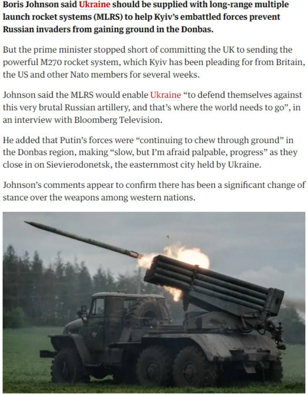 В то же время британский премьер Борис Джонсон заявил, что Украина должна быть снабжена реактивными системами залпового огня (РСЗО) большой дальности, пишет The Guardian.
