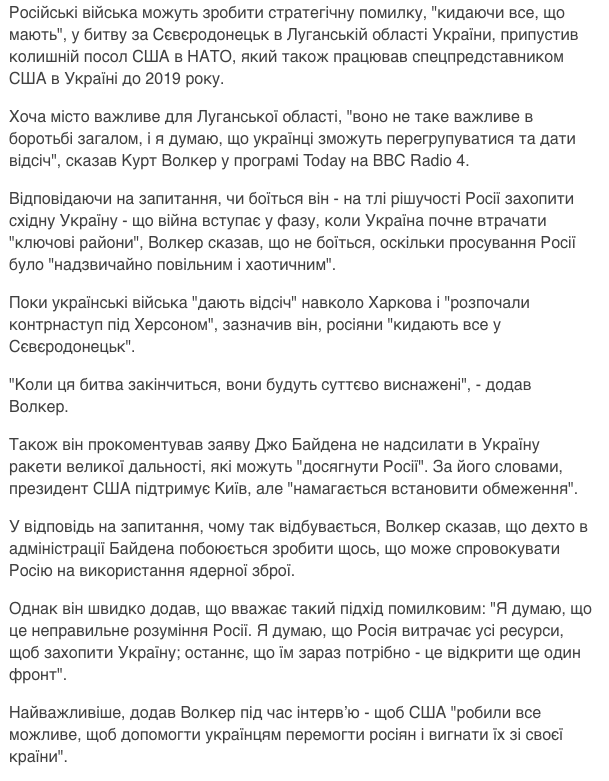 Волкер считает, что Россия допустила стратегическую ошибку, бросив все силы на Северодонецк, который не так важен для хода всей кампании. Зато после завершения этой операции российские войска будут полностью истощены, а украинские силы смогут пойти в наступление.