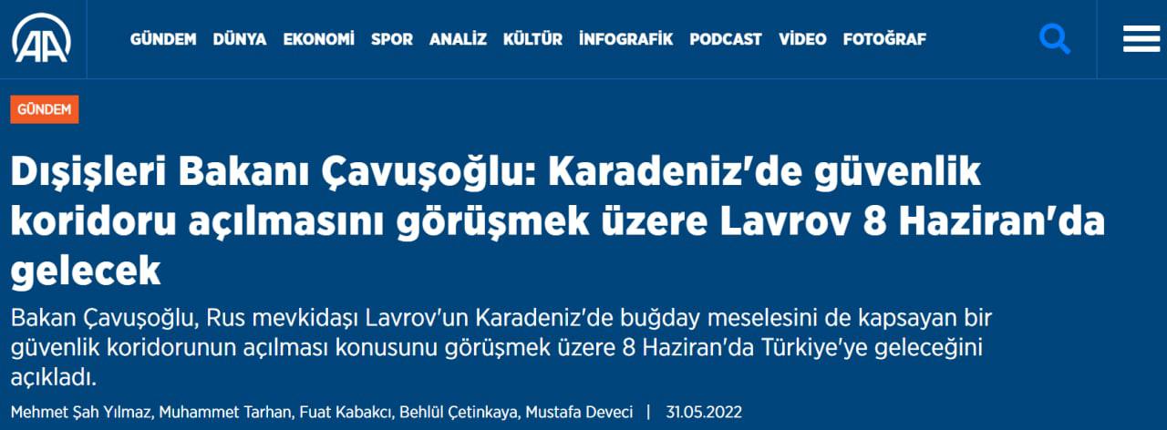 Ранее глава МИД РФ Сергей Лавров заявил, что РФ пропустит украинское зерно в Средиземное море, если Украина проведет разминирование прибрежных вод.