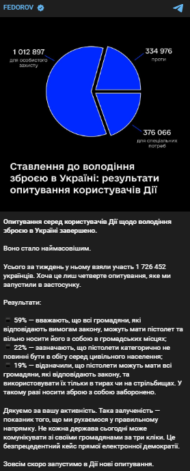 Ранее мы писали о промежуточных данных опроса в приложении "Дія", которые показывали, что 62,3% украинцев поддерживают легализацию оружия в целях личной защиты, 18,3% уверены, что оружие нужно для личных нужд, а 19,2% - против легализации.