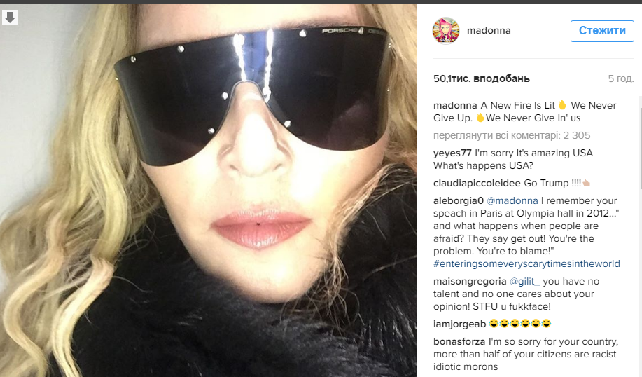В своем Instagram певица Мадонна написала, что "зажжен новый огонь, мы никогда не отступаемся и никогда не сдаемся".