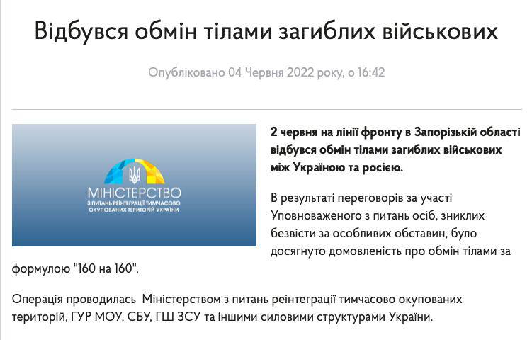 17.43 Украинские власти подтверждают обмен телами погибших военных в формате "160 на 160".