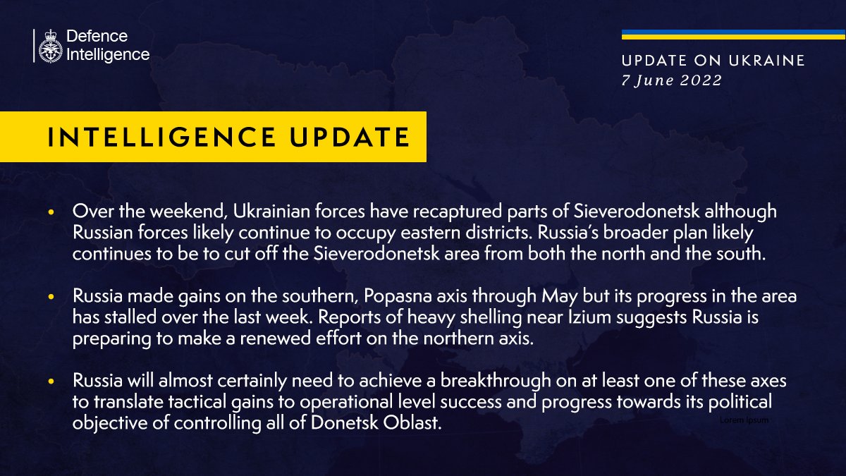 План РФ, по данным разведки, по-прежнему заключается в том, чтобы отрезать район Северодонецка как с севера, так и с юга.