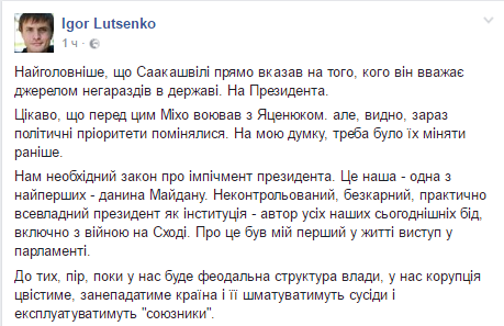 Впрочем, не все осудили эмоциональные порывы Саакашвили. Так, народный депутат фракции "Батькивщина", общественный деятель и экономист Игорь Луценко считает, что для любого человека очень важно указать на того, кого он считает источником бед в государстве.