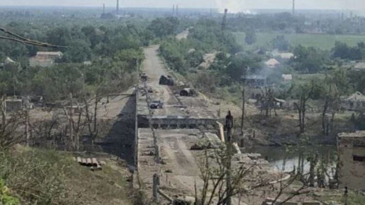 В сети появилась фотография так называемого Пролетарского моста в Северодонецке, который, как сегодня сообщал глава Луганской ОВА Сергей Гайдай, разбили ударами россияне.