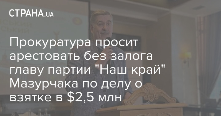 Прокуратура просит арестовать без права залога главу партии "Наш край" Александра Мазурчака, задержанного по обвинению в получении взятки в 2,5 млн долларов.
