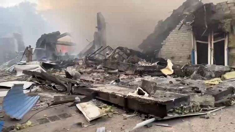 В одном ролике практически полностью разрушенное малоэтажное кирпичное здание, которое тушат пожарные. В другом снята панорама города с дымом от пожаров на месте прилетов.