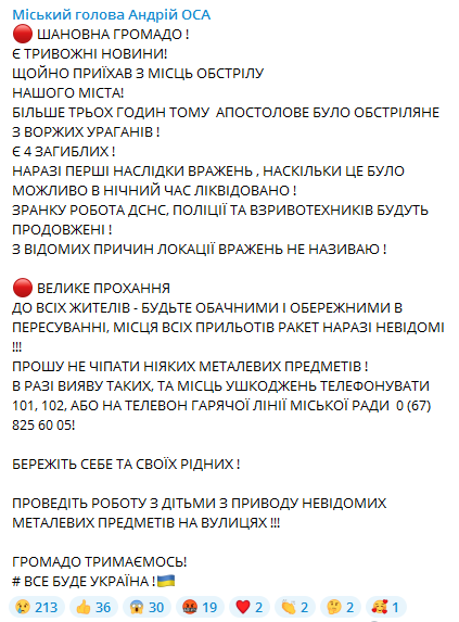 Ночью российские войска обстреляли из реактивных систем залпового огня "Ураган" город Апостолово в Днепропетровской области. Погибли минимум четыре местных жителя.