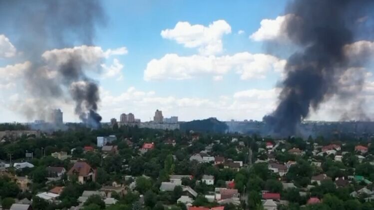 На ролике можно заметить густые столбы дыма, которые поднимаются сразу из нескольких точек города.