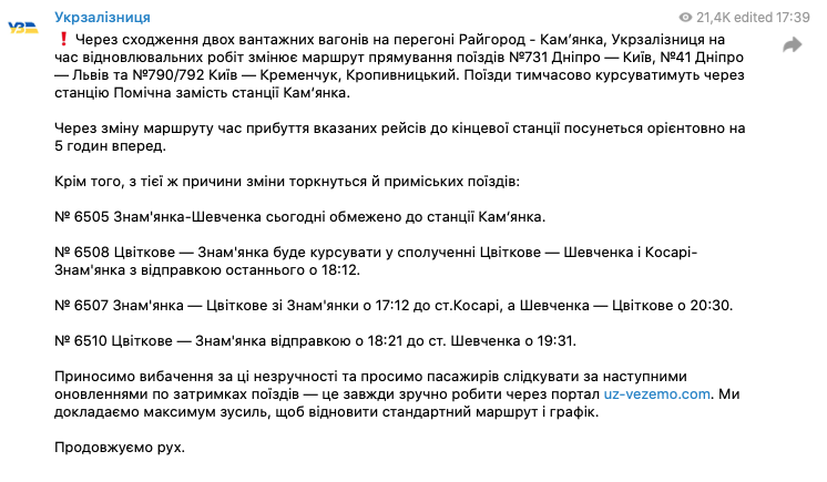 "Укрзализныця" предупреждает о временном изменении маршрута следования поездов №731 Днепр - Киев, №41 Днепр - Львов и №790/792 Киев - Кременчуг, Кропивницкий. Поезда будут временно курсировать через станцию ​​Помошная вместо станции Каменка.