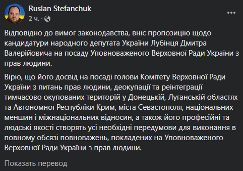 "Согласно требованиям законодательства, внес предложение по кандидатуре народного депутата Украины Лубинца Дмитрия Валерьевича на должность уполномоченного Верховной Рады Украины по правам человека", - написал Стефанчук.