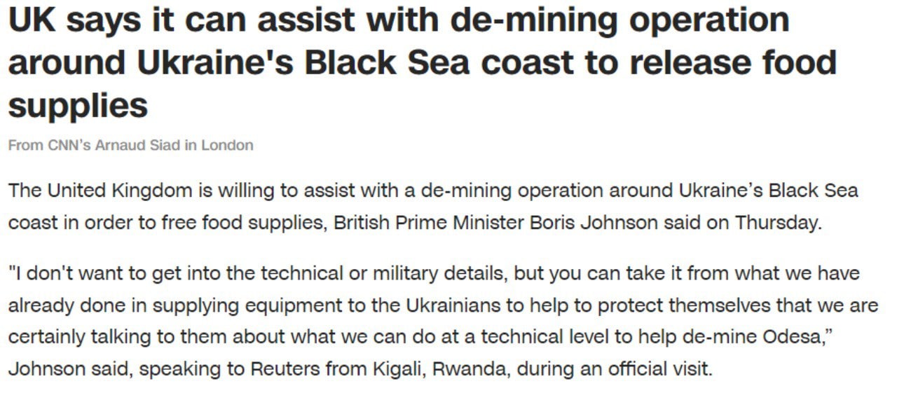 20.59 Великобритания готова помочь в операции по разминированию одесского порта, чтобы высвободить запасы продовольствия.