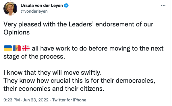 "Очень приятно, что лидеры поддержали наши мнения. Украине, Молдове и Грузии есть над чем поработать, прежде чем перейти к следующему этапу процесса. Я знаю, что они будут двигаться быстро. Они знают, насколько это важно для их демократии, их экономики и их граждан", - написала фон дер Ляйен в Twitter.