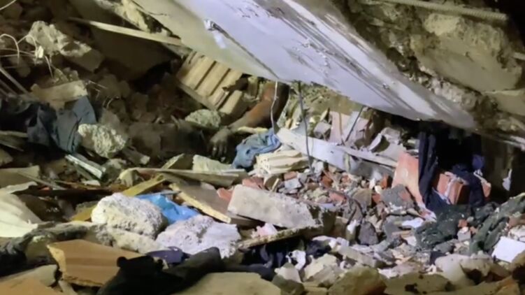 Появилось видео, как спасатели вытаскивают тело погибшего из-под завалов дома в Киеве, куда прилетела ракета