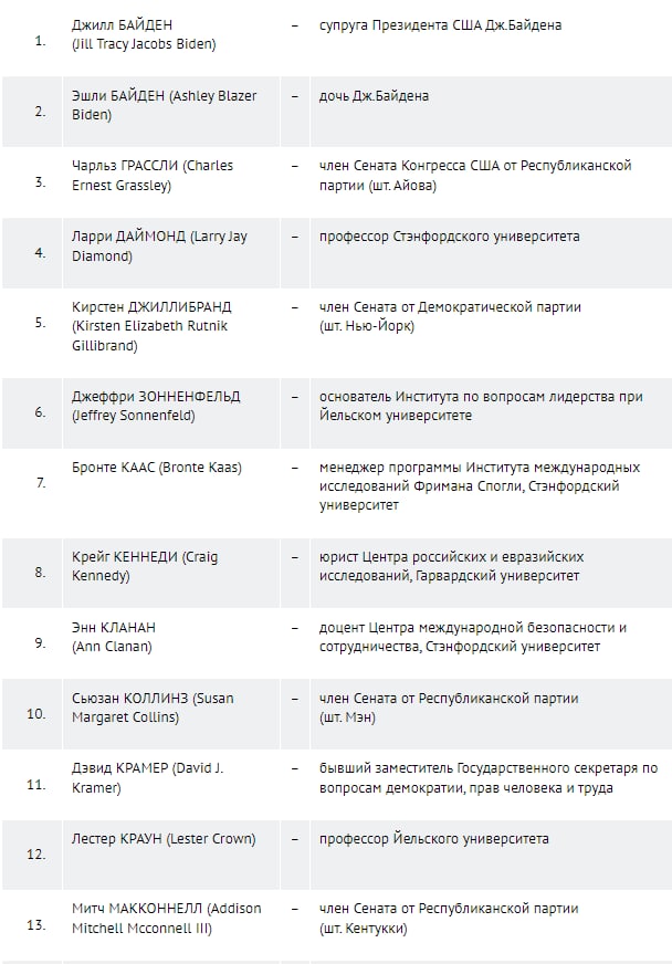 В список из 25 человек вошли супруга и дочь президента США - Джилл и Эшли Байден, а также сенаторы - участники группы "Макфол-Ермак", которые занимаются разработкой рекомендаций относительно санкций против РФ.