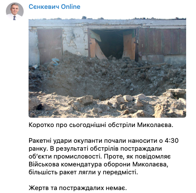 Также Сенкевич рассказал, что жертв в результате ракетного удара нет.