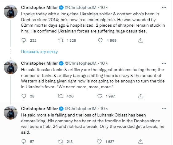 Он сказал, что российские танки и артиллерия приносят самые большие проблемы. Количество танков и орудий, стреляющих по ним, просто безумно, а объема западной помощи, предоставляемой прямо сейчас, будет недостаточно, чтобы переломить ситуацию в пользу Украины.