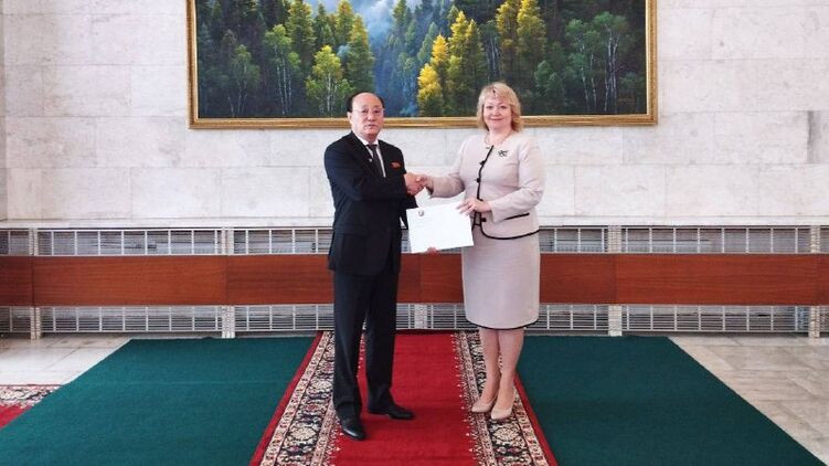 Также появилось фото, на котором посол КНДР в Москве Син Хон Чхоль вручает "послу ДНР" в РФ Ольге Макеевой документ о признании "республики".