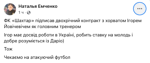 "Игорь имеет опыт работы в Украине, делает ставку на молодежь и хорошо понимает Дарио (Срну - Ред.). Так что ждем атакующего футбола", - написала Наталья.