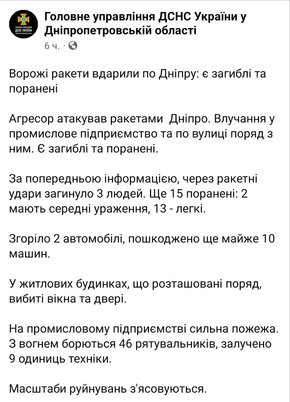 Позже в Минобороны России подтвердили ракетный удар по Днепру и написали, что "ударом уничтожены цеха по производству комплектующих и ремонту баллистических ракет "Точка-У" и реактивных снарядов для систем залпового огня на оборонном предприятии "Южмаш".