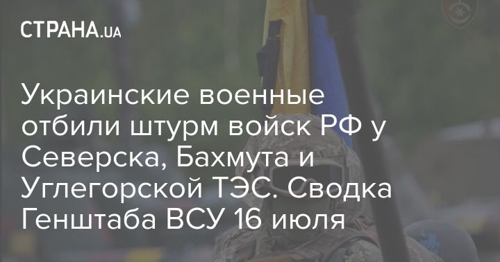 В Генеральном штабе Вооруженных сил Украины опубликовали оперативную сводку с фронта боевых действий по состоянию на 18:00 16 июля, в которой говорится, что российские войска пытались штурмовать населенные пункты у Северска и Бахмута, а также безуспешно атаковали Углегорскую ТЭС.
