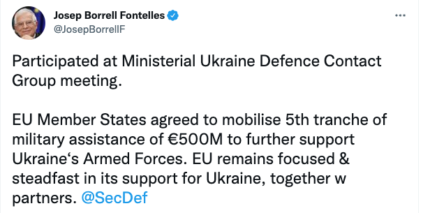 "Участвовал в заседании Контактной группы по обороне Украины при Министерстве обороны. Государства-члены ЕС согласились мобилизовать пятый транш военной помощи в размере 500 млн евро для дальнейшей поддержки Вооруженных сил Украины. ЕС остается сосредоточенным и непоколебимым в своей поддержке Украины вместе с партнерами", - написал Боррель.