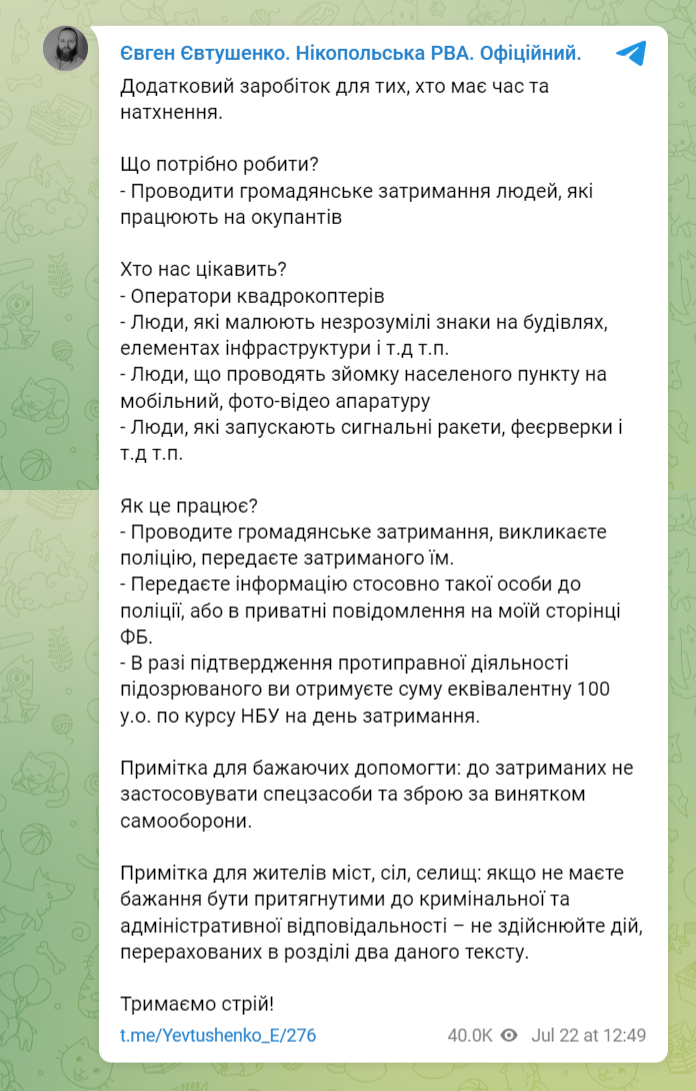 Чтобы получить деньги, людям предлагают провести гражданское задержание подозрительных лиц, вызвать полицию и передать ей задержанного. Также правоохранителям нужно передать информацию о таких лицах (либо написать Евтушенко в Facebook).